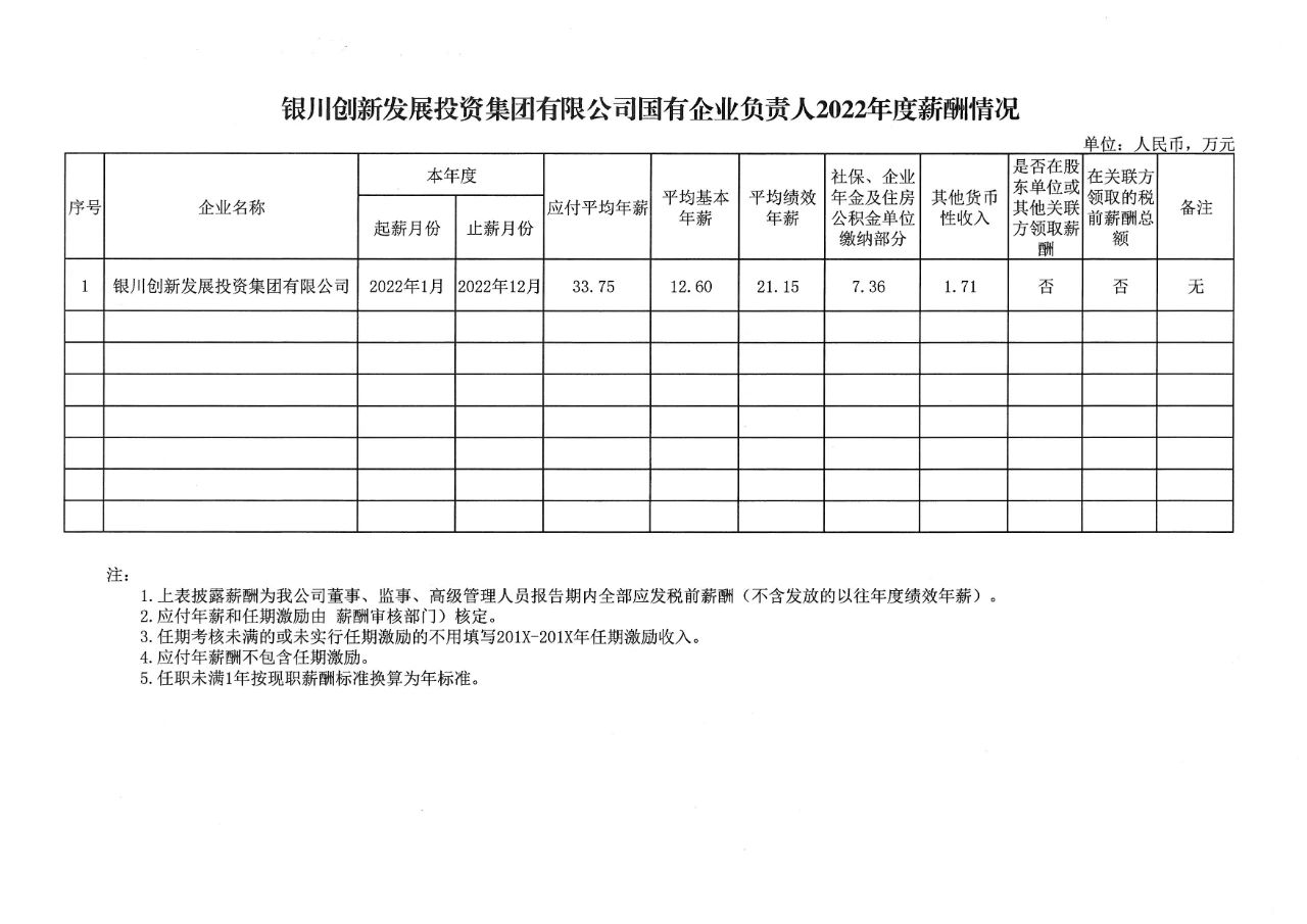 根據(jù)《銀川市屬國有企業(yè)負責人薪酬管理辦法(試行)》(銀國資發(fā)〔2021〕458號)、《銀川市屬國有企業(yè)負責人經(jīng)營業(yè)績考核辦法(試行)》(銀國資發(fā)〔2021〕459號)、《銀川市屬國有企業(yè)負責人經(jīng)營業(yè)績考核實施細則(試行)》規(guī)定,經(jīng)銀川市國資委核定,現(xiàn)將銀川創(chuàng)新發(fā)展投資集團有限公司企業(yè)負責人2022年度薪酬信息予以披露。
